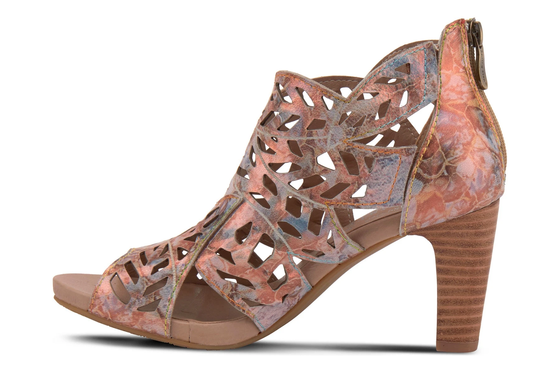 French inspired design, hand-painted leather peep toe laser-cut bootie. Heel Height (approximately): 3 1/4″ stacked, 1/2″ platform.