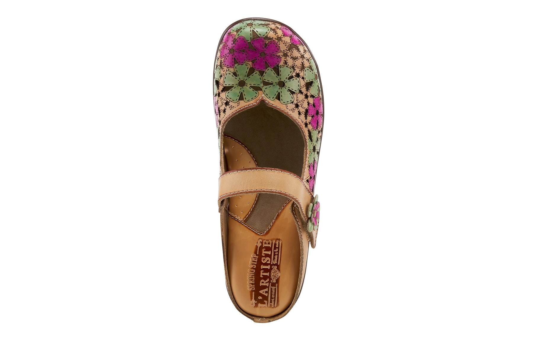 Stylish French-inspired open-back leather clog with an adjustable strap featuring hand-painted, laser-cut, and etched floral design to bring beautiful style all on our signature comfort sole.