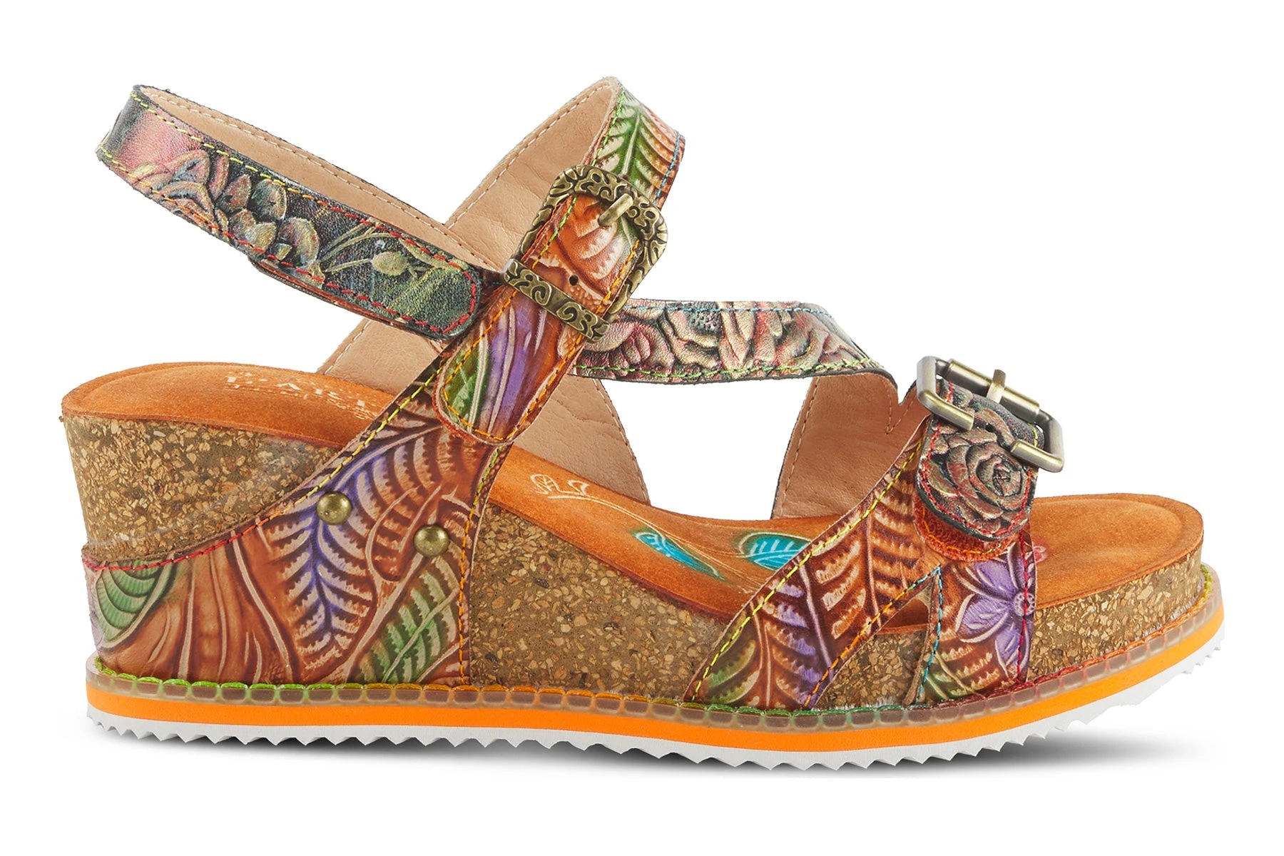 This ultra-feminine wedge heel has such great details with the decorative metal buckles and buttons. Hand-painted all the way from the outsole to the insole so that you never stop looking at the design.