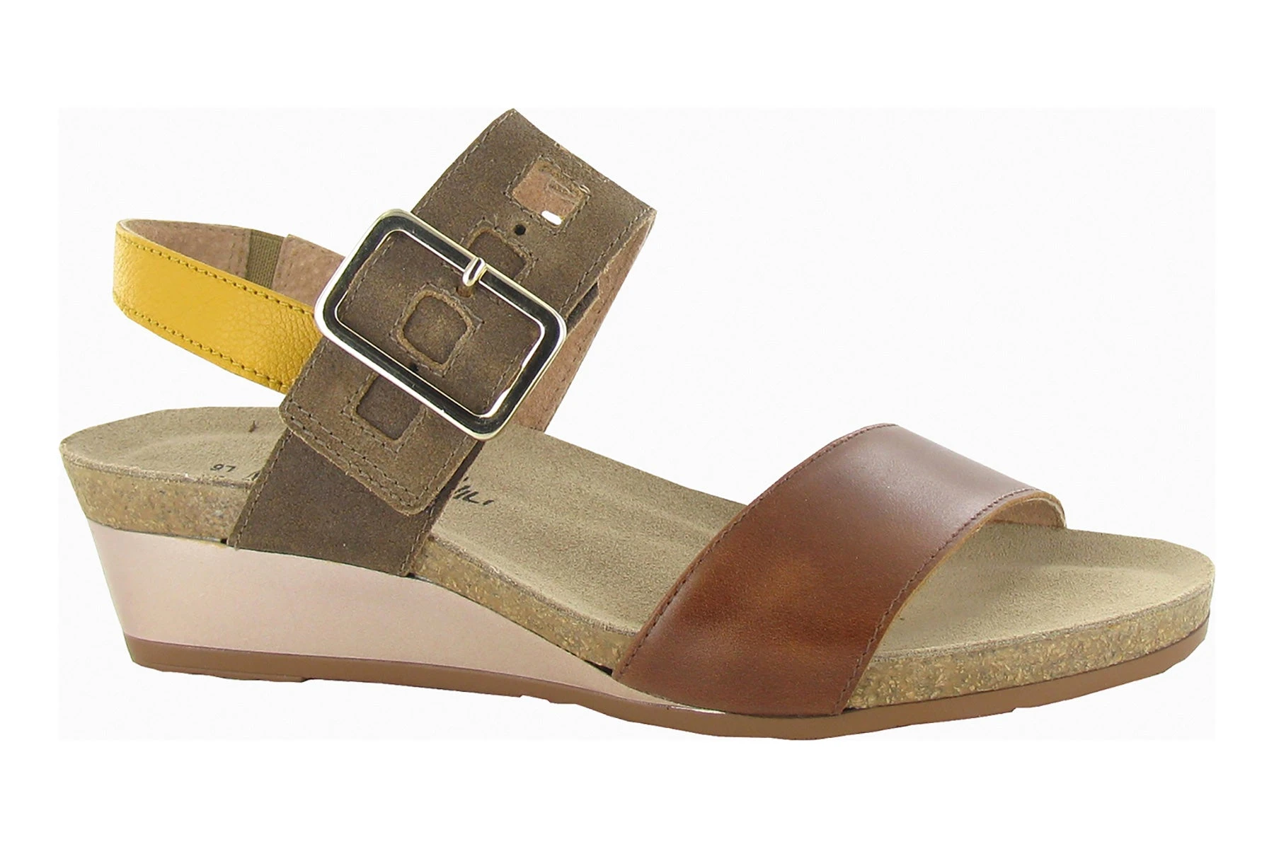 Naot Dynasty is a wedge sandal built for comfort all day and night. These sandals have radiant multi-colored straps, adjustable hook and loop closure and 1.75″ wedge heel. A leather upper lining and open-toe silhouette completes this elegant wedge.