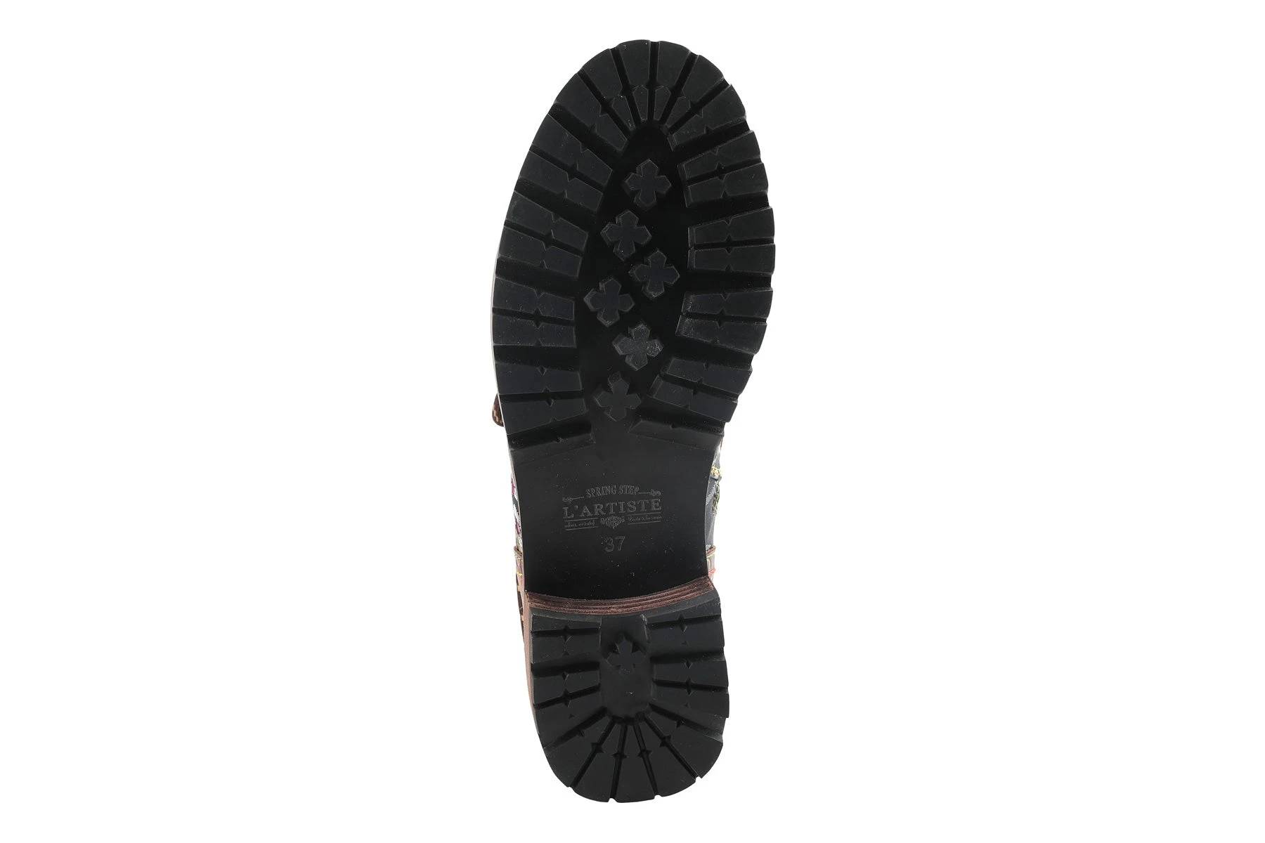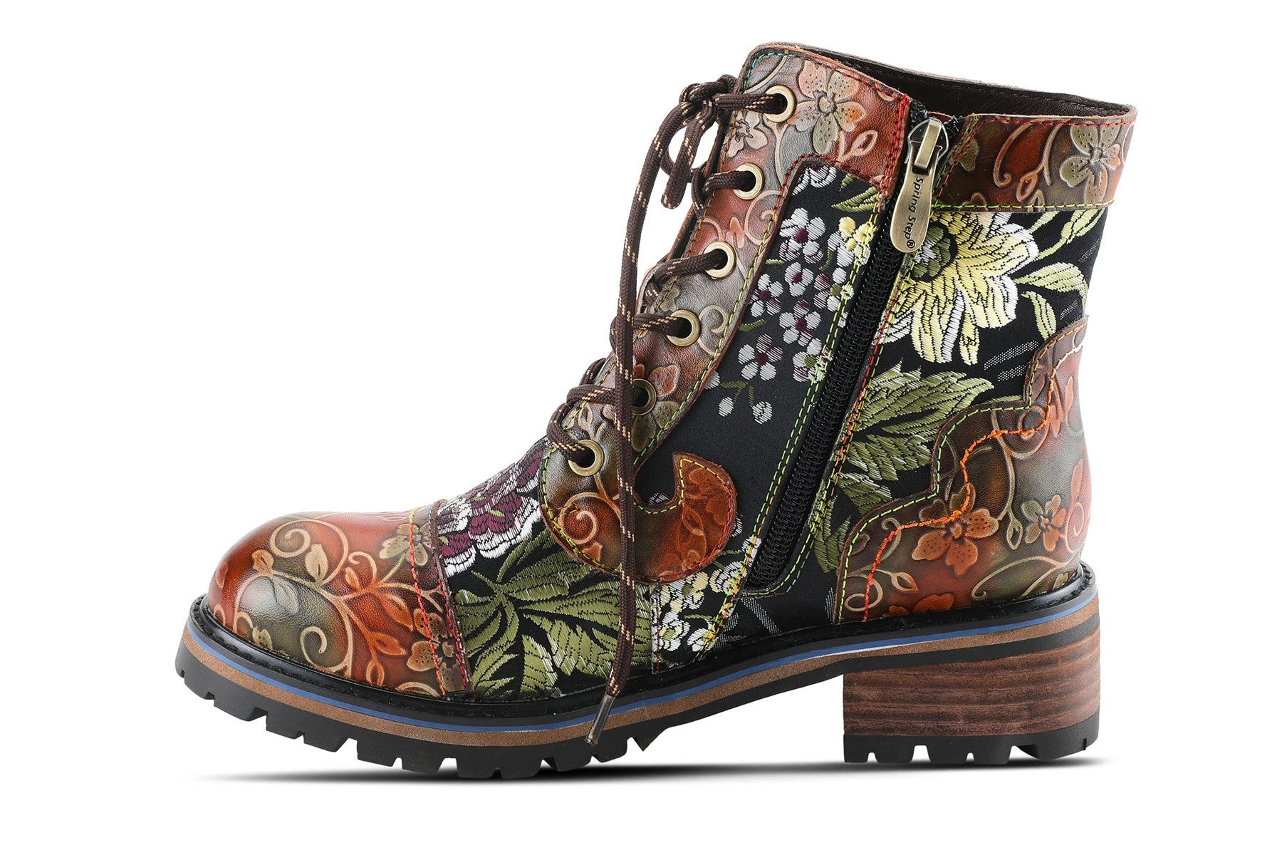 L`Artiste FANTASTIC Incredible leather combination bootie showing an embroidered textile and embossed floral leather on a comfort lug sole.