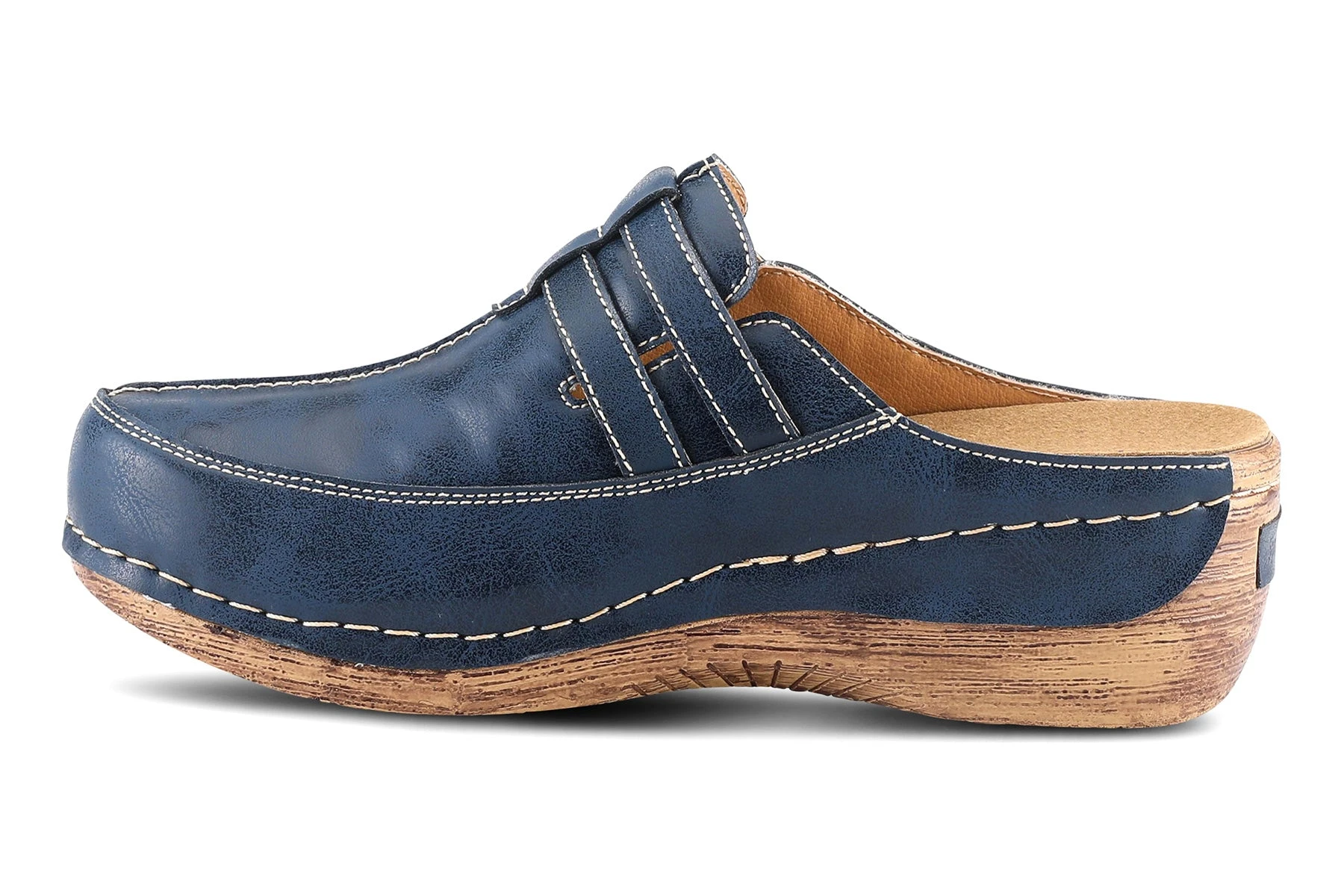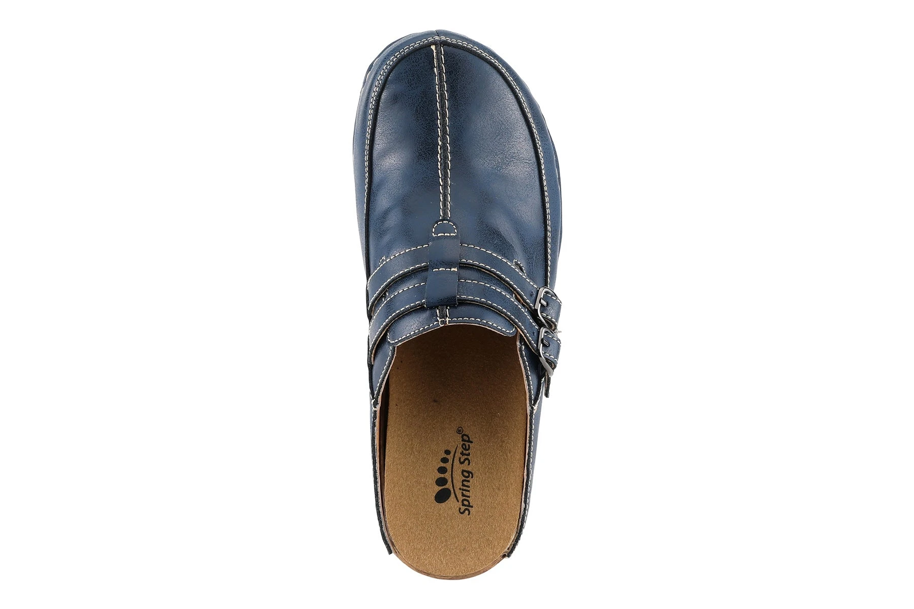 Leather multi-strap slip-on clog styled with antiqued metal buckles and contrast stitch detail.