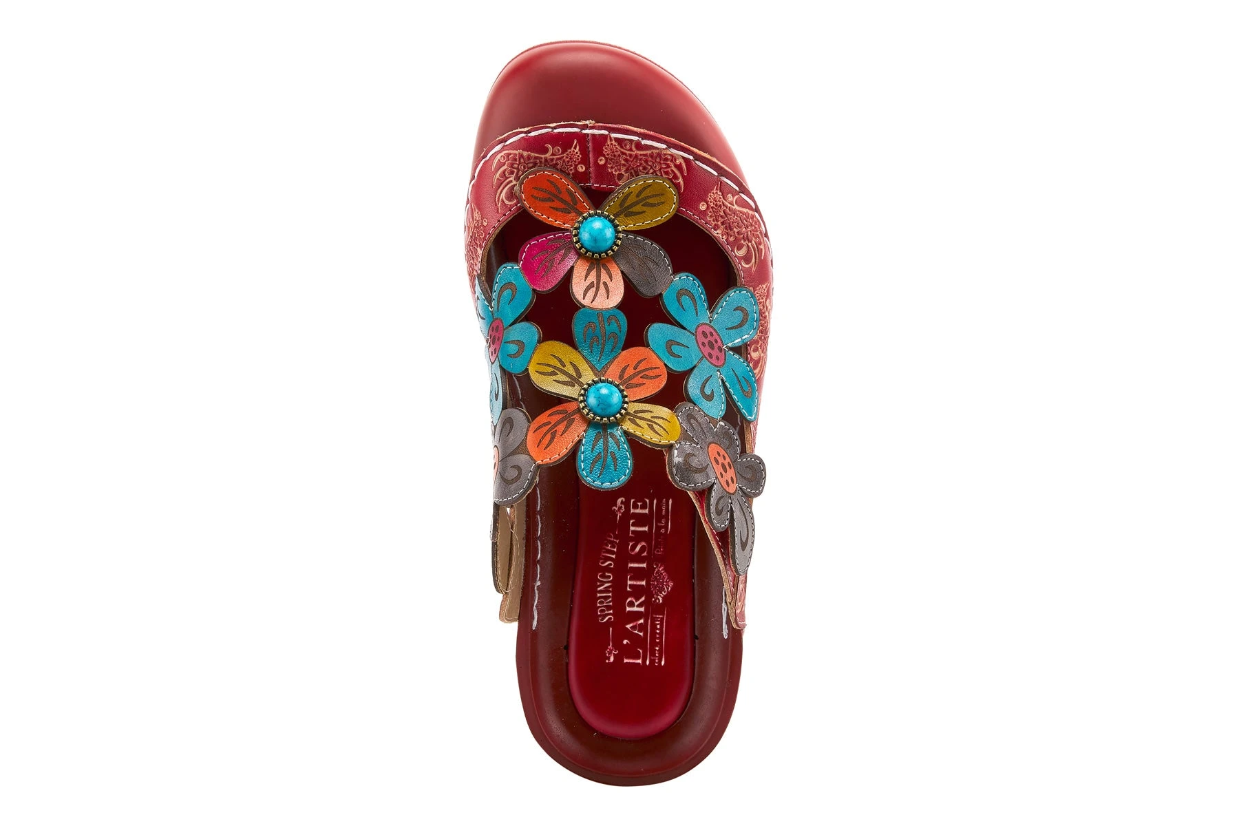 Bright and colorful hand-painted leather clog detailed with flowers and two turquoise color stones set in an antique metal casing to accent the center, all with a water-friendly toe cap and comfort sole.