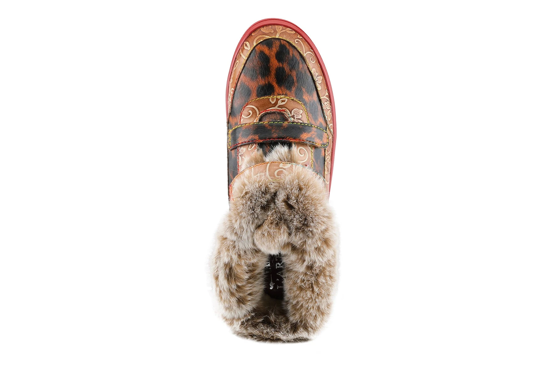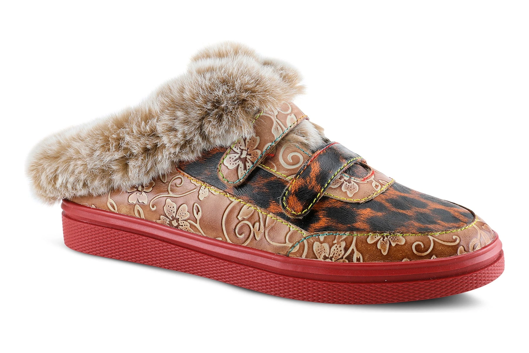 L`Artiste Style: LAMYA -Indoor/outdoor slipper featuring an animal print trimmed in an embossed floral print and plush faux-fur with cozy lining on a flexible, comfortable sole.