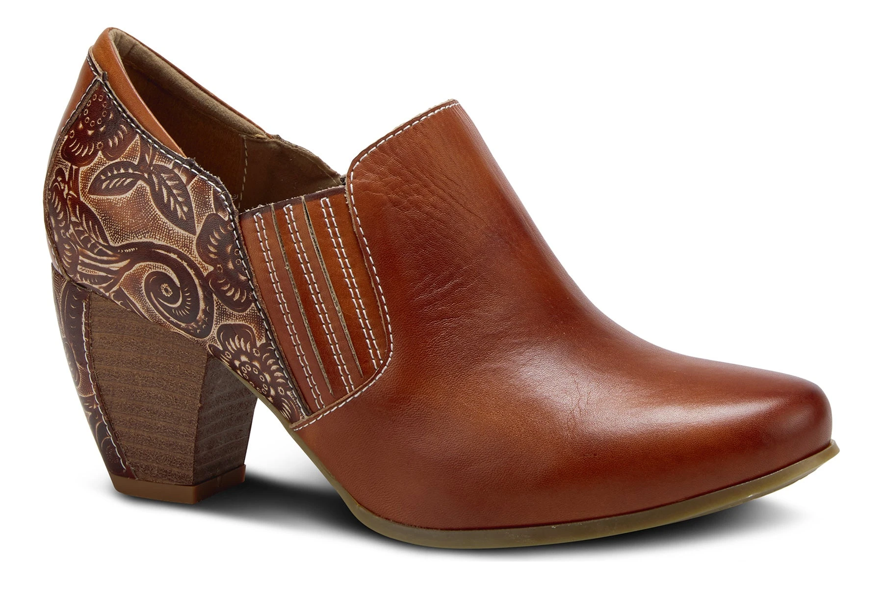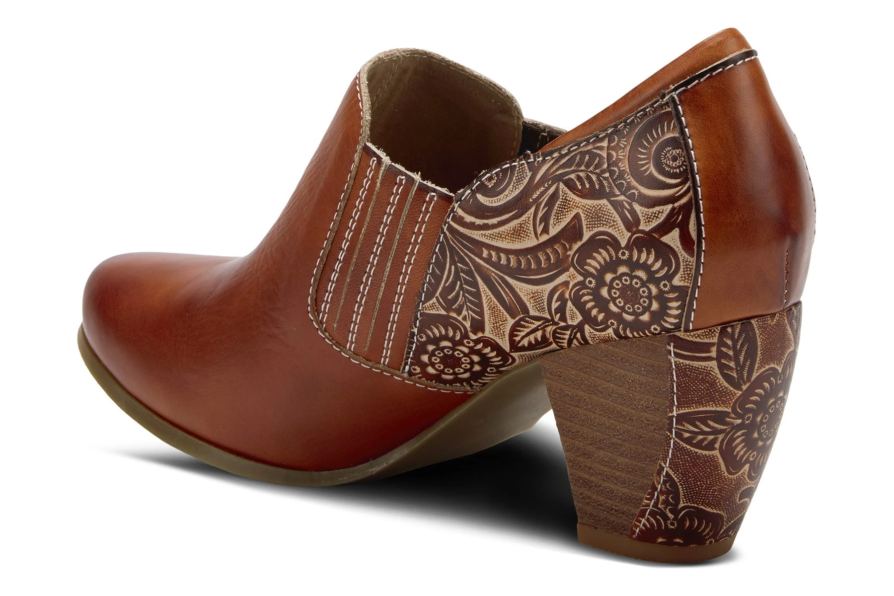 L`Artiste Style: Leatha -Western- inspired Slip-on shootie detailed in hand-painted and tooled leather on a matching tooled leather-wrapped curved stacked heel with inside and outside symmetrical leather covered elastic goring for easy on/off.
