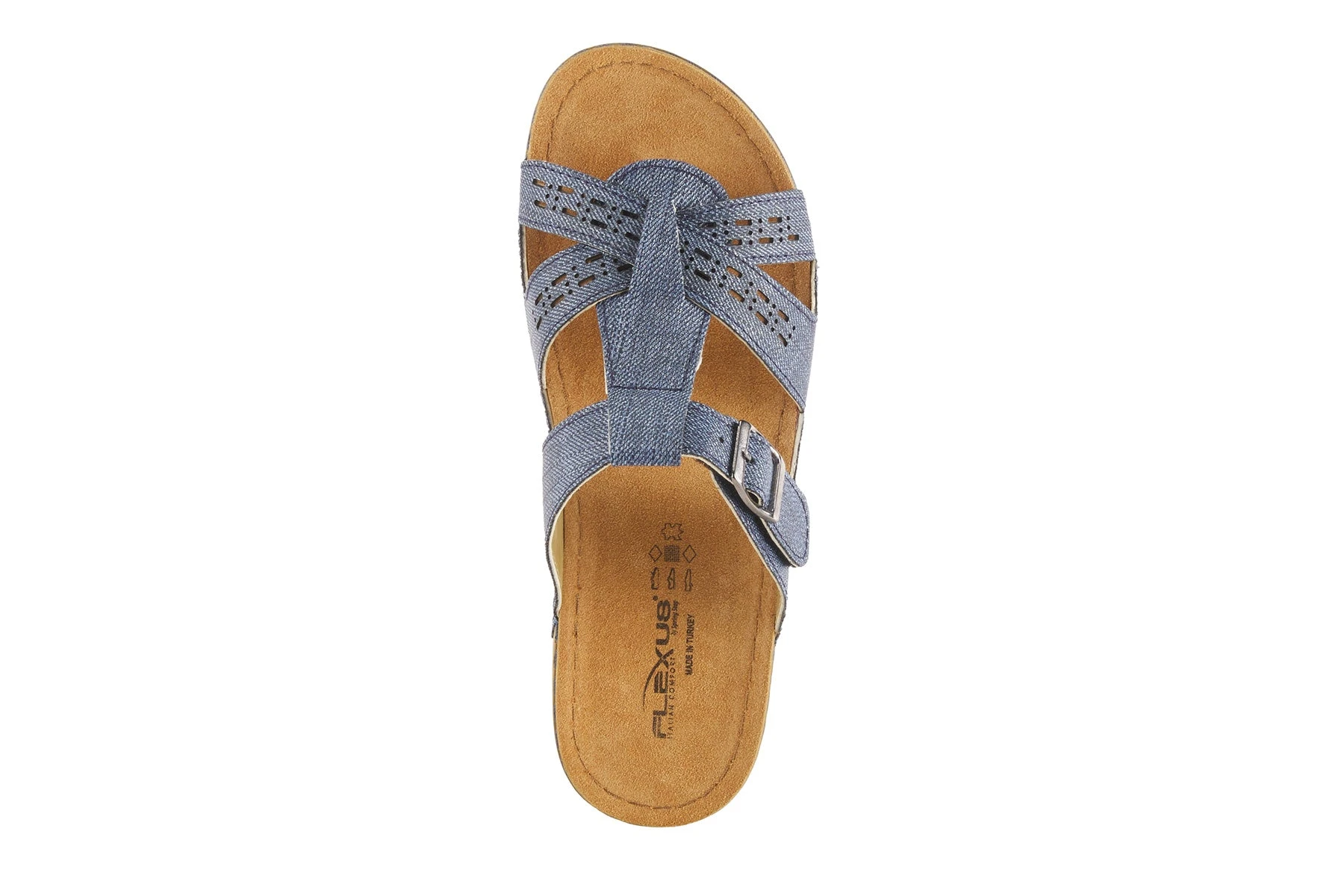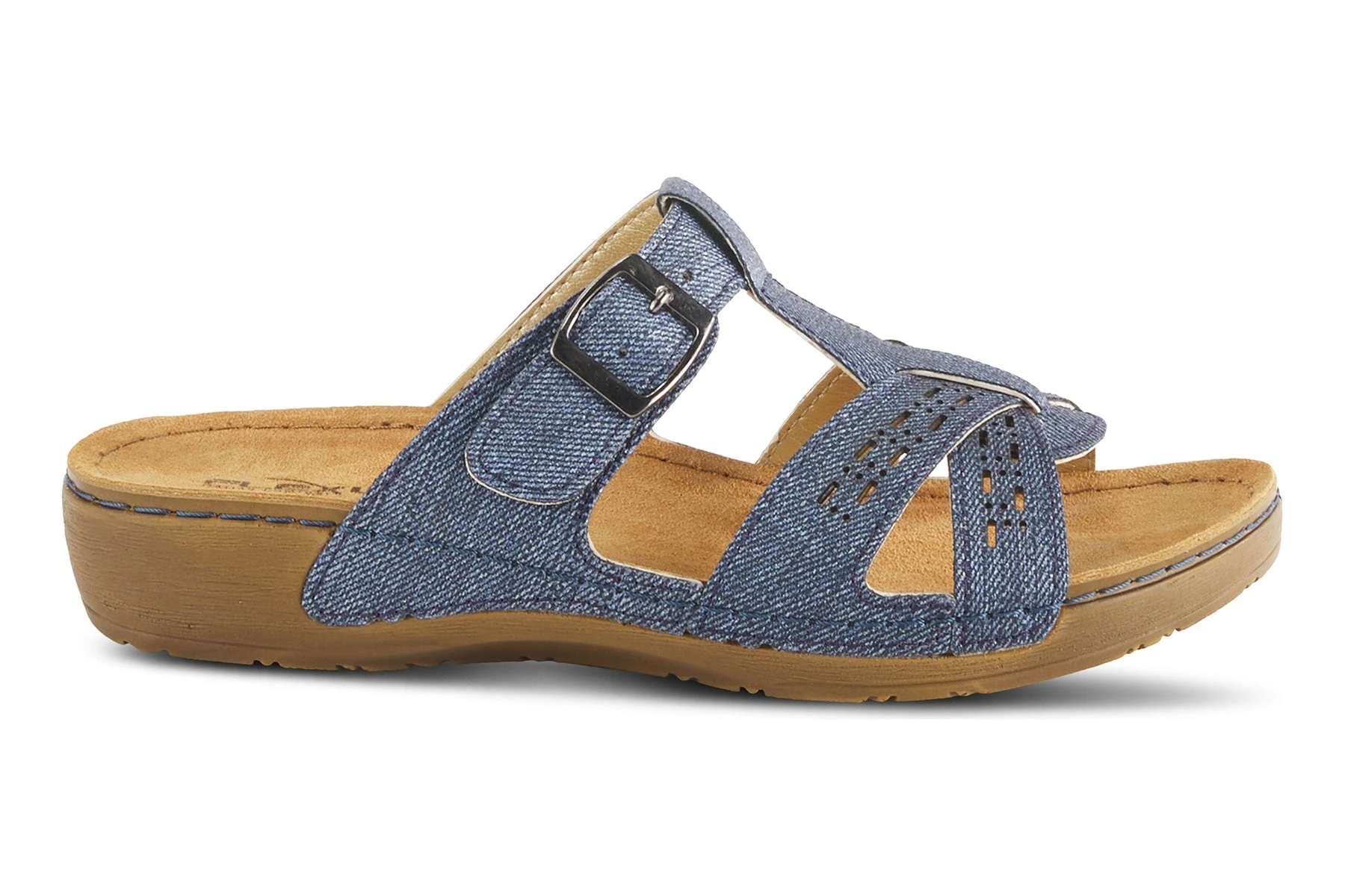 Stylish flatform sandal slide with a criss cross upper made from denim material with perforated geometric designs and a decorative buckle that has hook and loop adjustability.