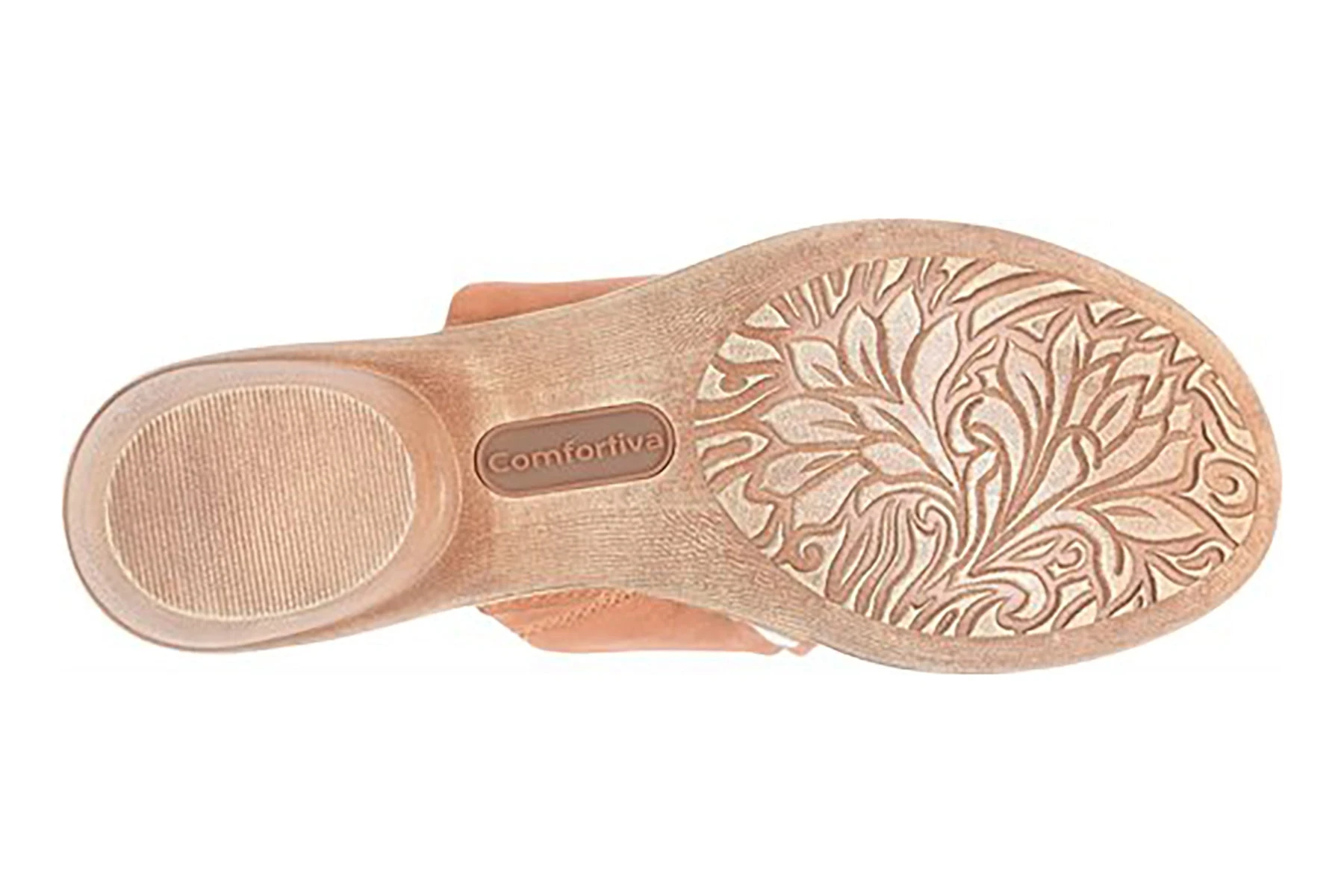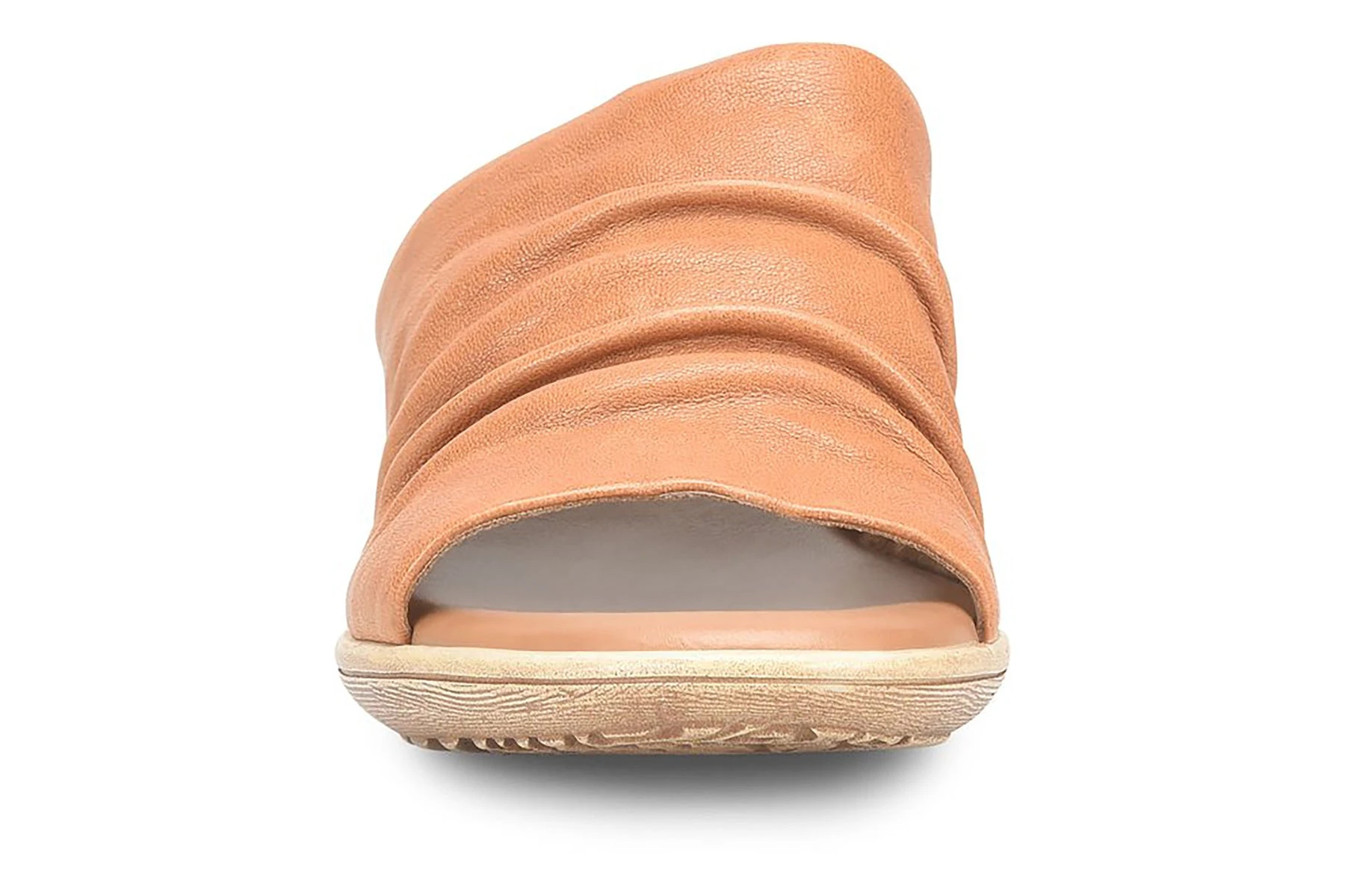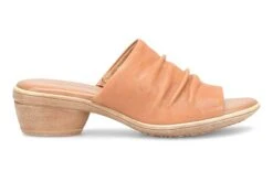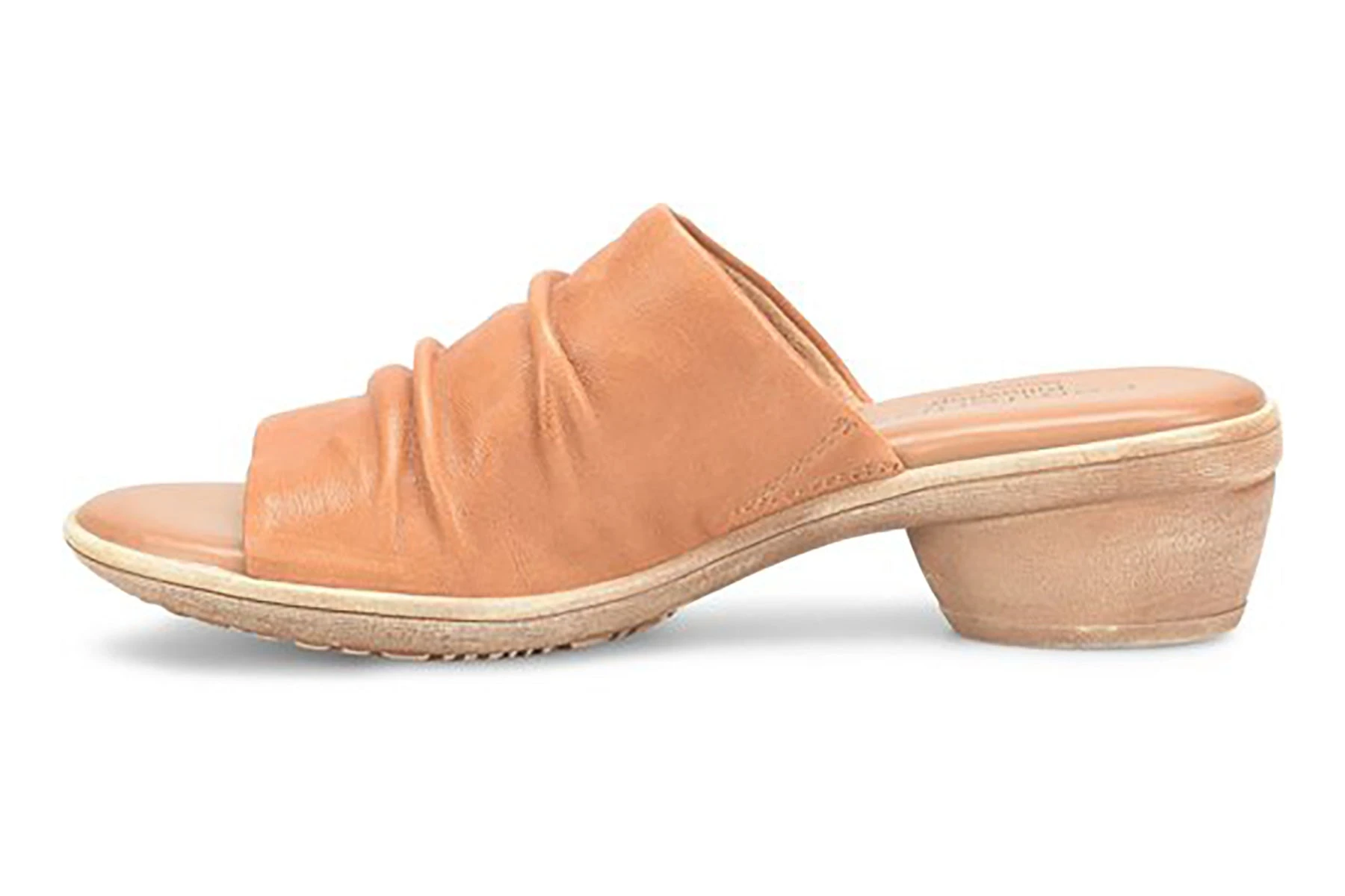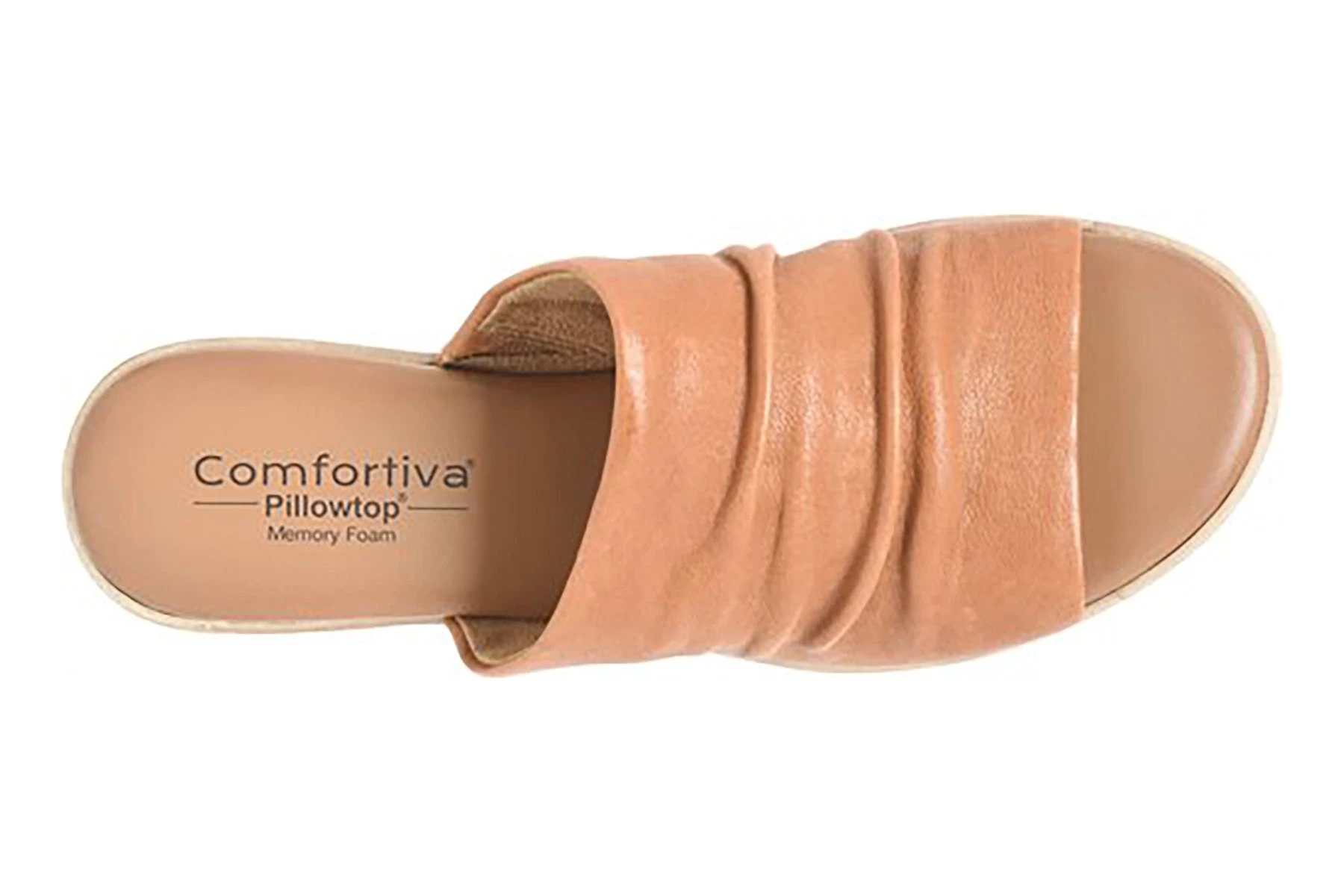 Comfortiva Norene is a rounded heel slide sandal crafted for comfort. These dressy slides have a ruched design, leather uppers and a memory foam footbed. A synthetic microfiber lining, 2 inch rounded heel and slip-resistant outsole makes this sandal an irresistible slide for any special occasion.