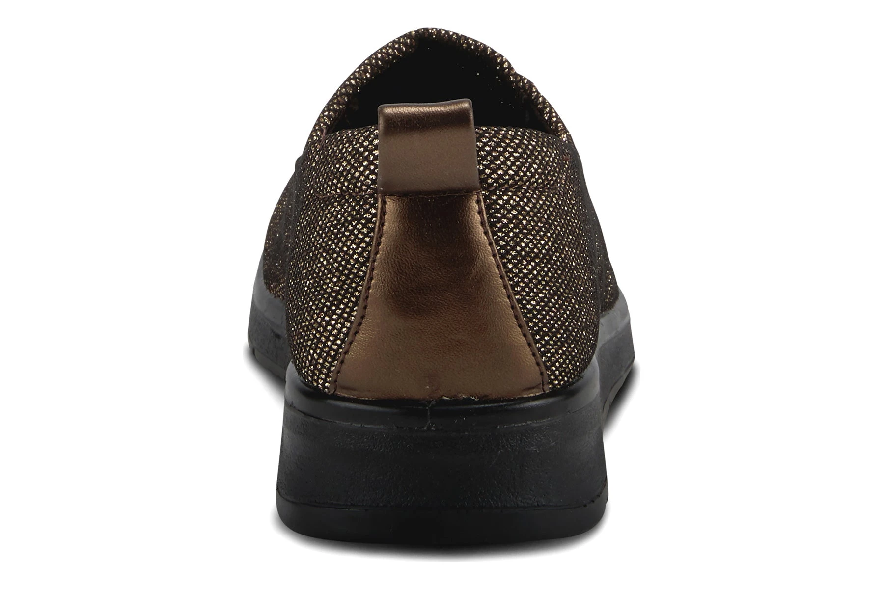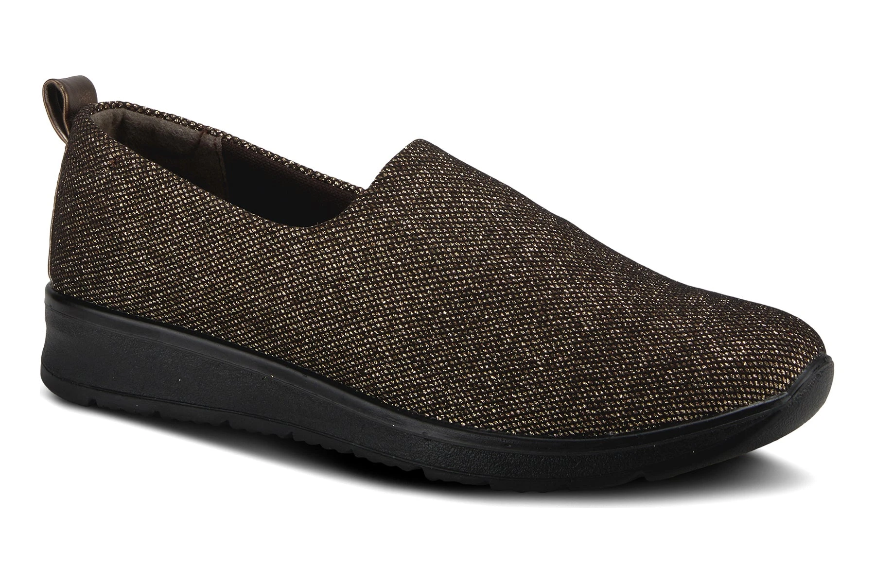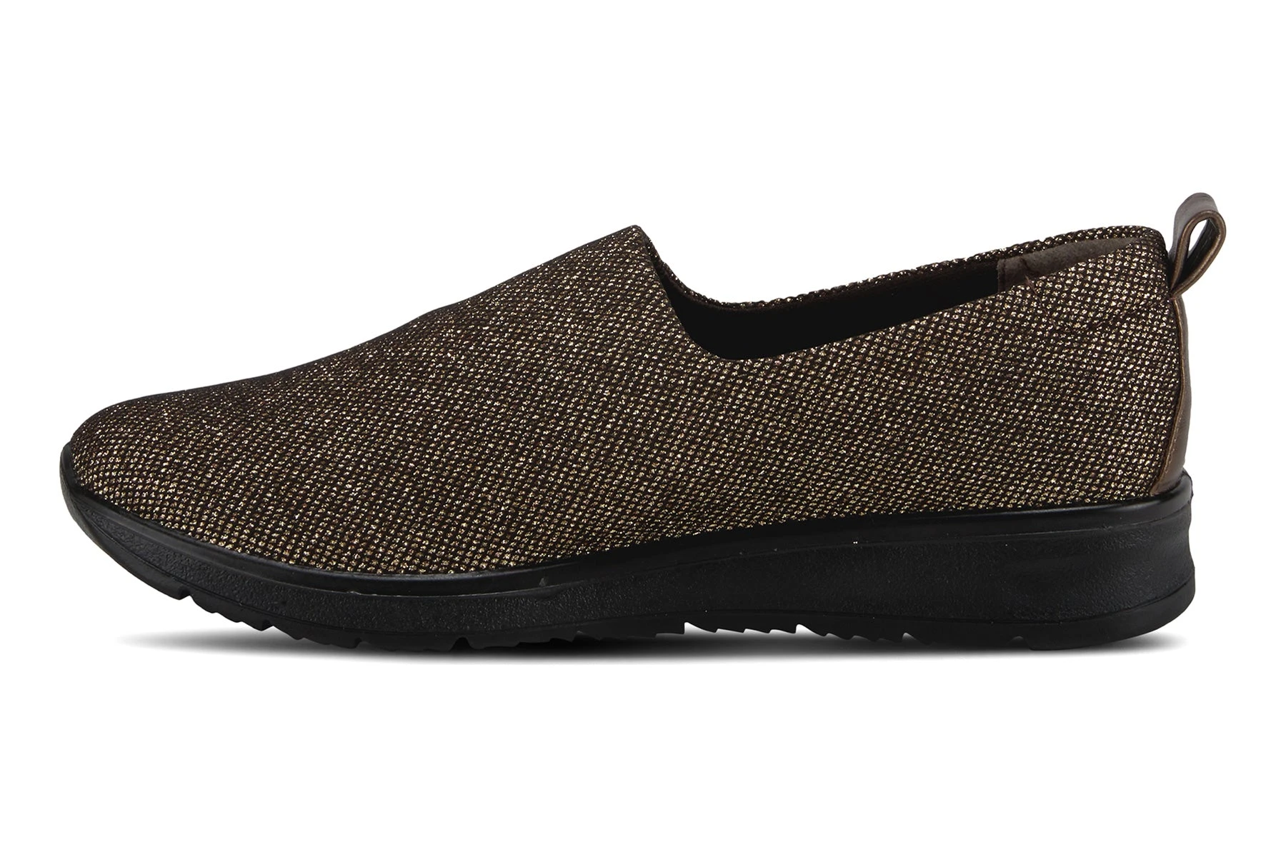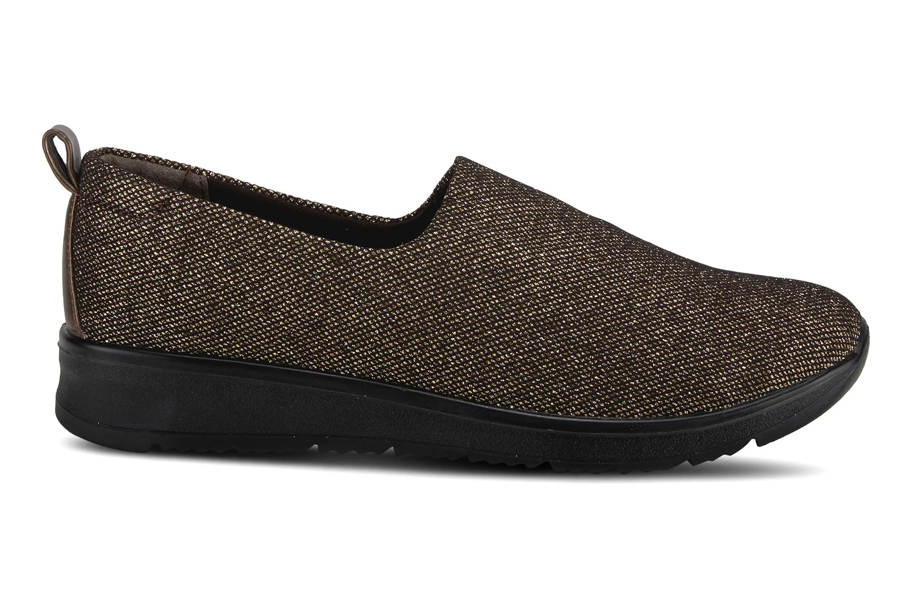 Sporty Slip-on with a beautiful one piece woven glittered upper, featuring a full length comfortable padded footbed and easy pull on heel tab all on a light weight wedge sole.
