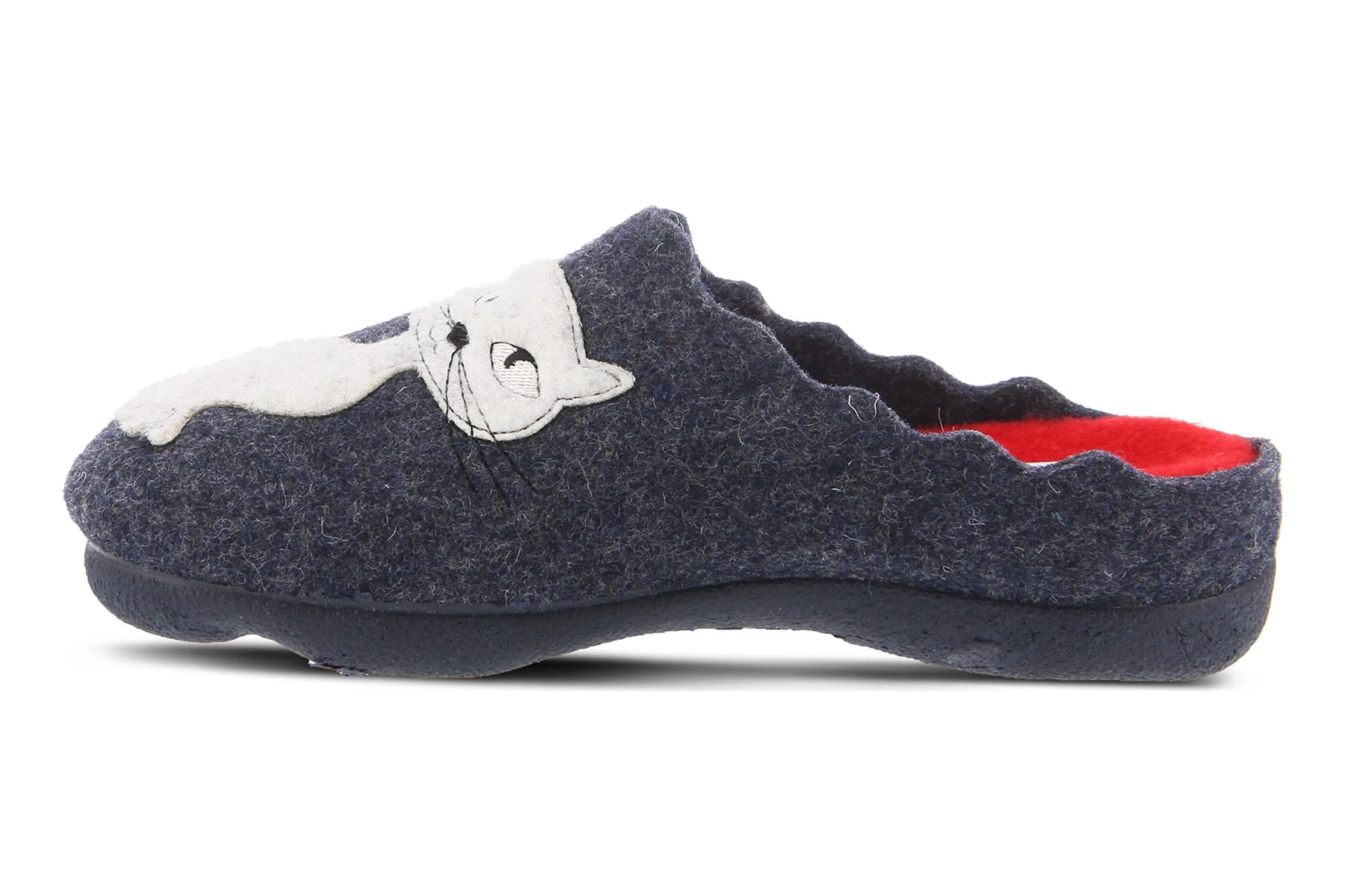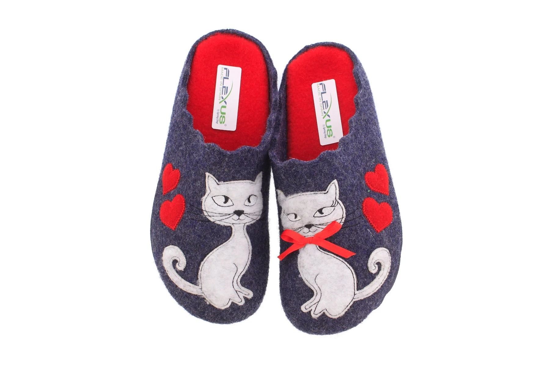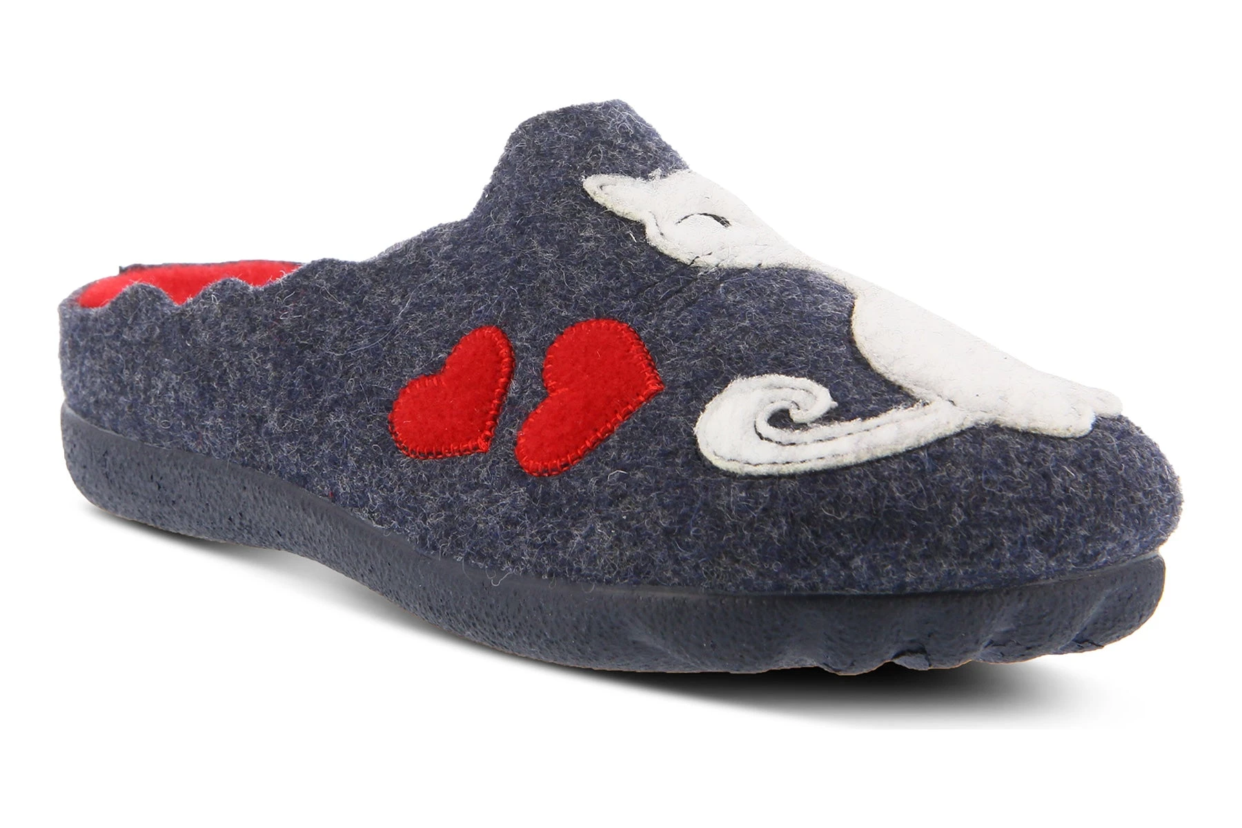Easy to Slip-on indoor/outdoor wool slipper featuring a loving kitty cat duo.