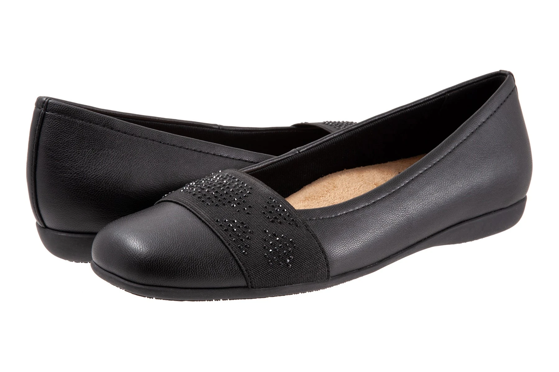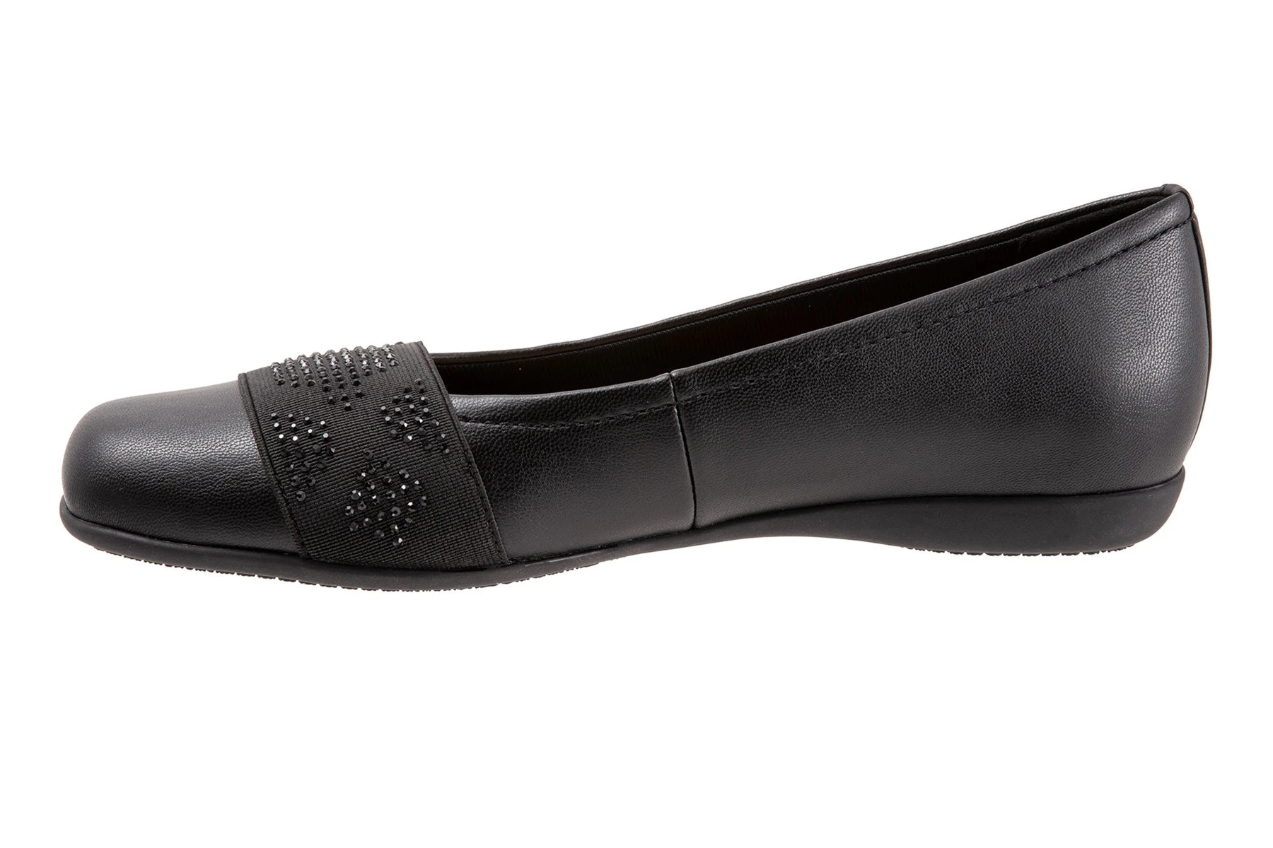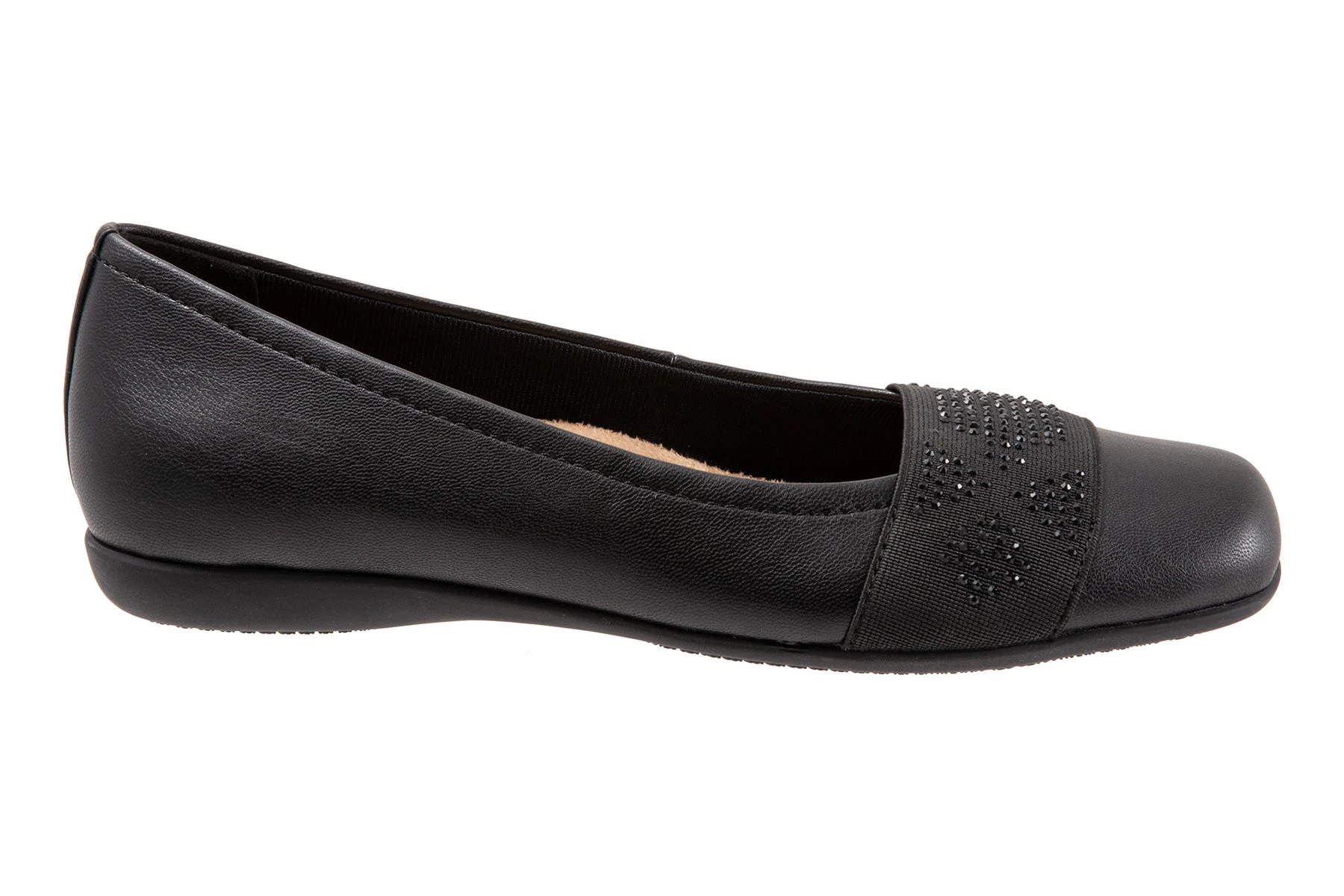 Geometric, reflective rhinestones adorn a square toe ballerina striking a balance between fashion and comfort for easy-to-wear versatility.