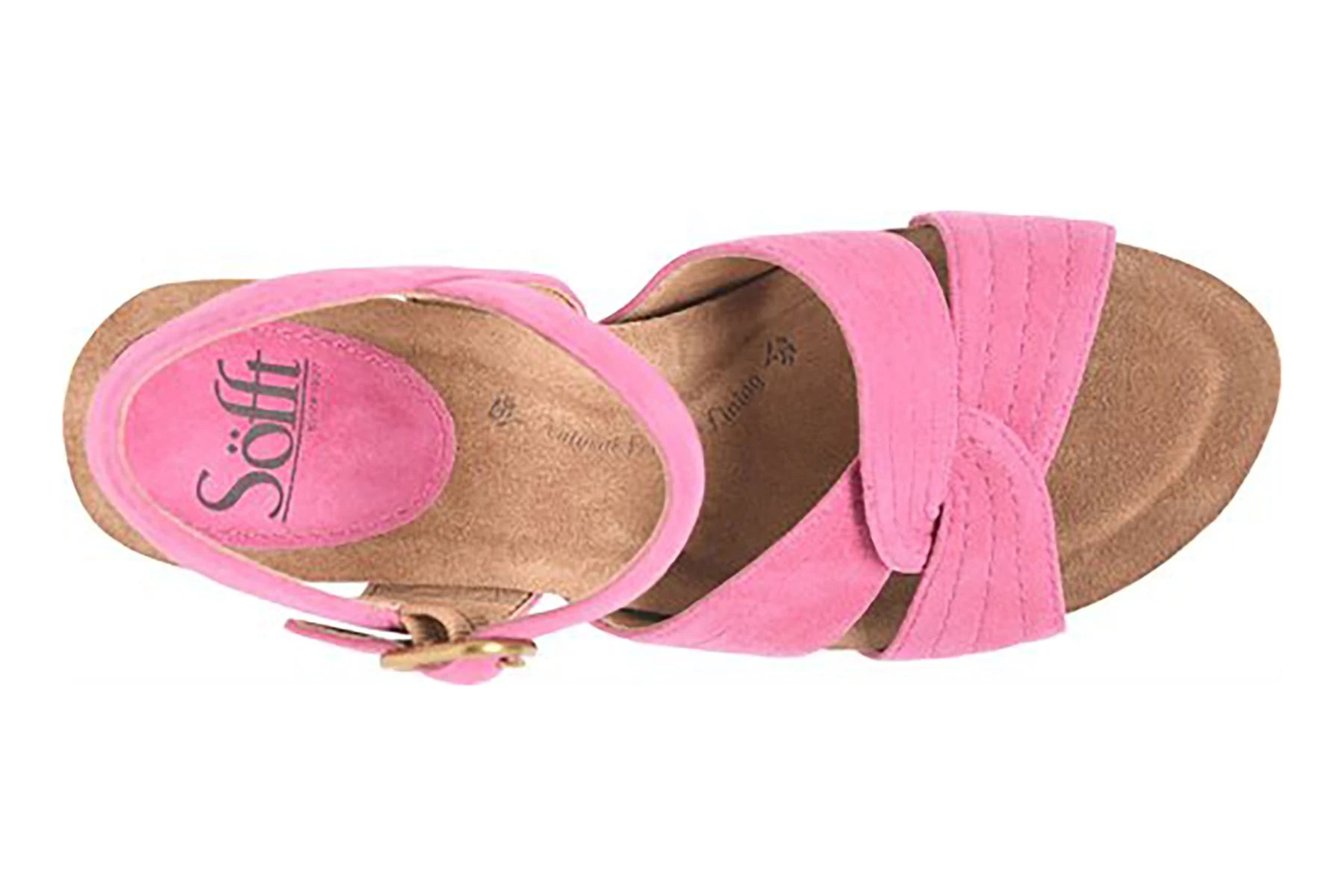 Sofft Clarissa is a classy and comfortable wedge heel sandal. Features include leather uppers, padded insole and wrapped basketweave PU wedge with TPR outsole. A cushioned cork footbed, adjustable ankle buckle strap, leather lining and 3 ½ inch heel height outlines these versatile sandals.