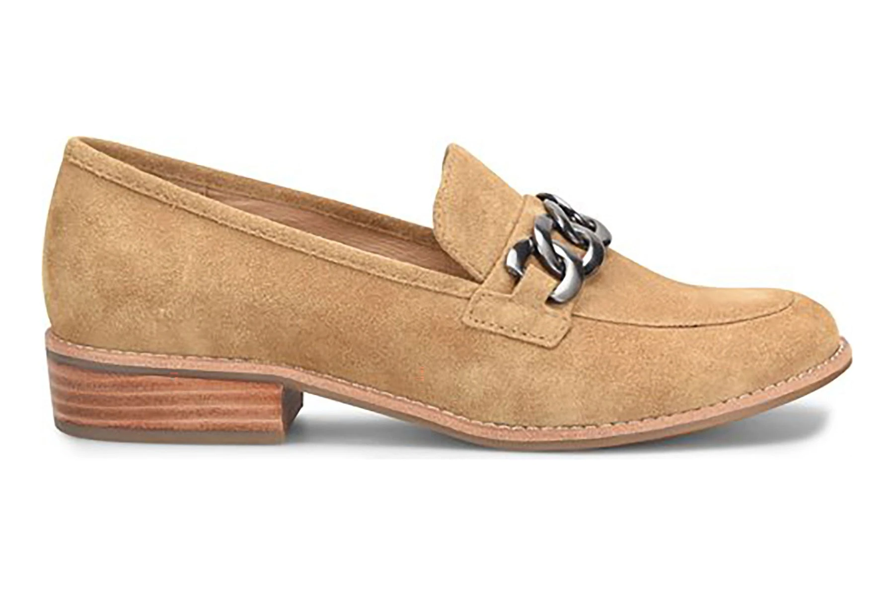 Sofft Nevara is a trendy and comfortable loafer. Smooth leather uppers support feet, chain link ornament adds elegance and cushioned footbed provides comfort. A lightweight and flexible TPR outsole and leather stacked 1 ¼ inch heel completes these loafers.