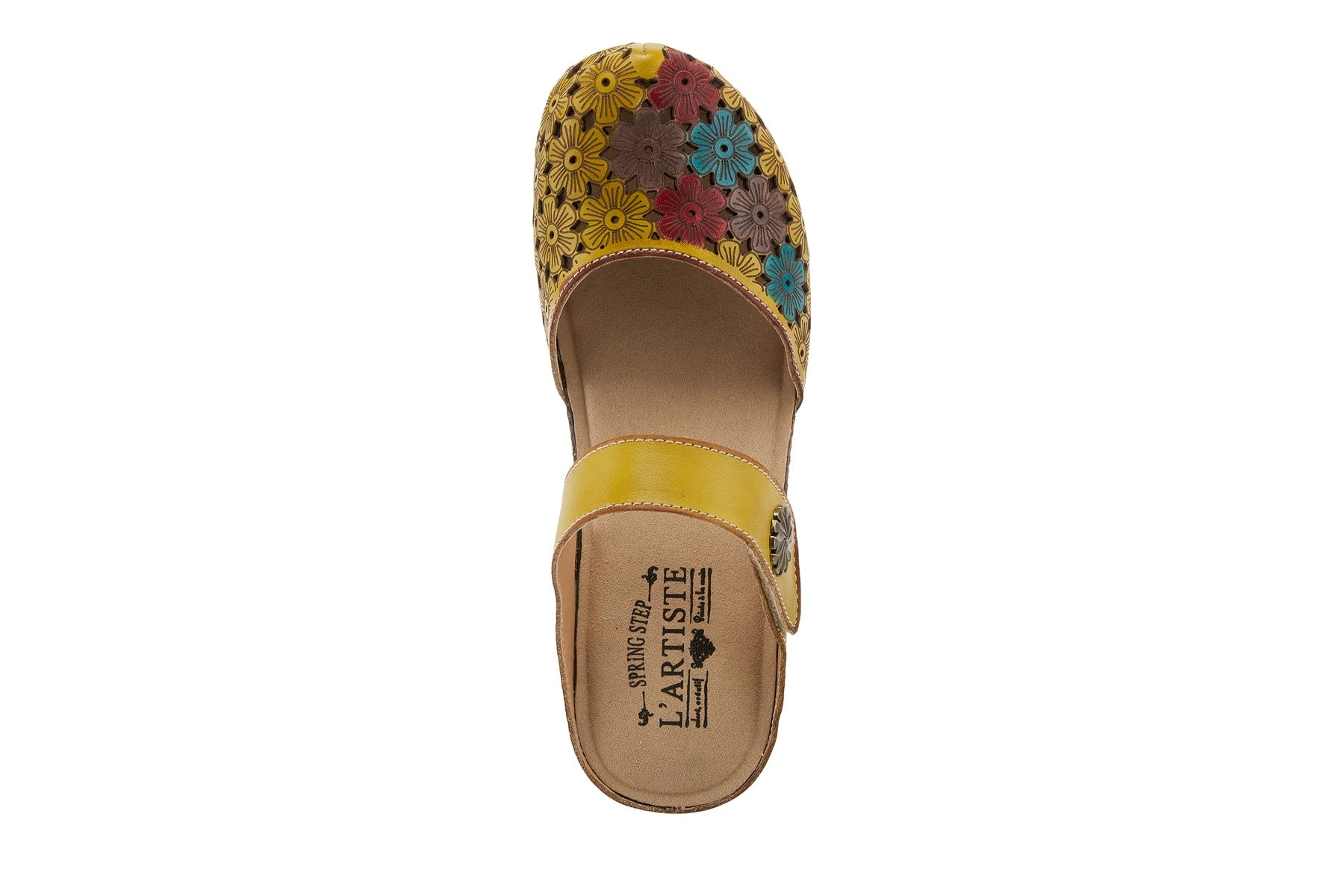 French-inspired, beautiful hand-painted premium leather clog featuring floral laser etching and cutout design, tonal stitchwork, and an adjustable hook and loop instep strap with an antiqued brushed metal ornament all on a cork and latex-wrapped, comfort wedge with a platform.