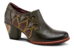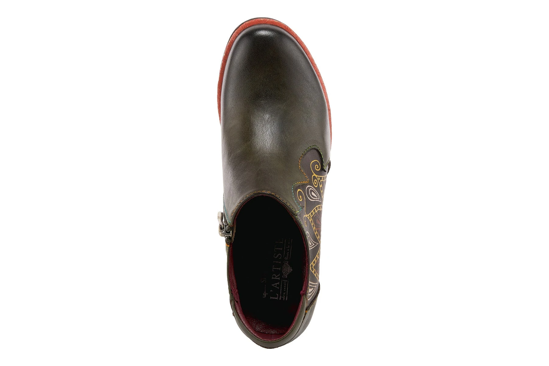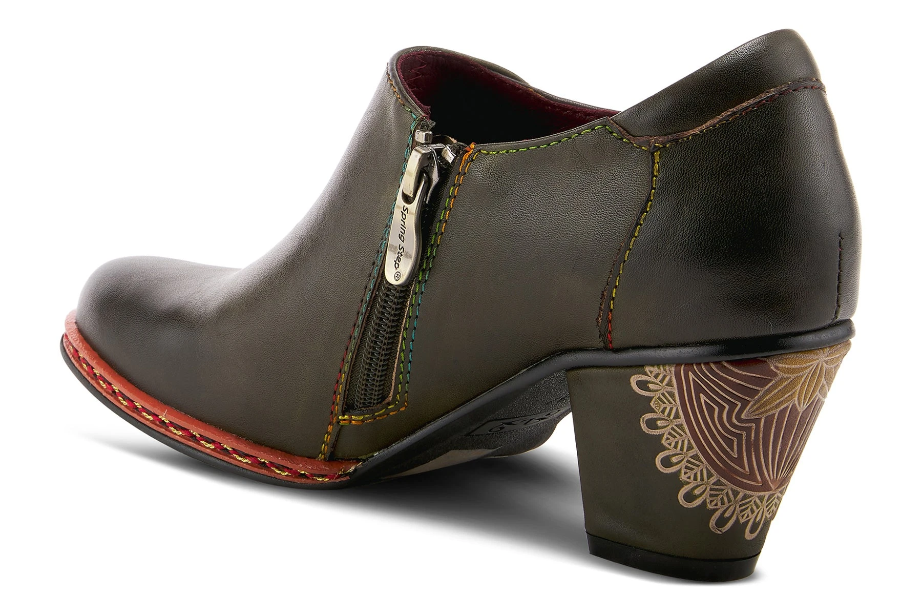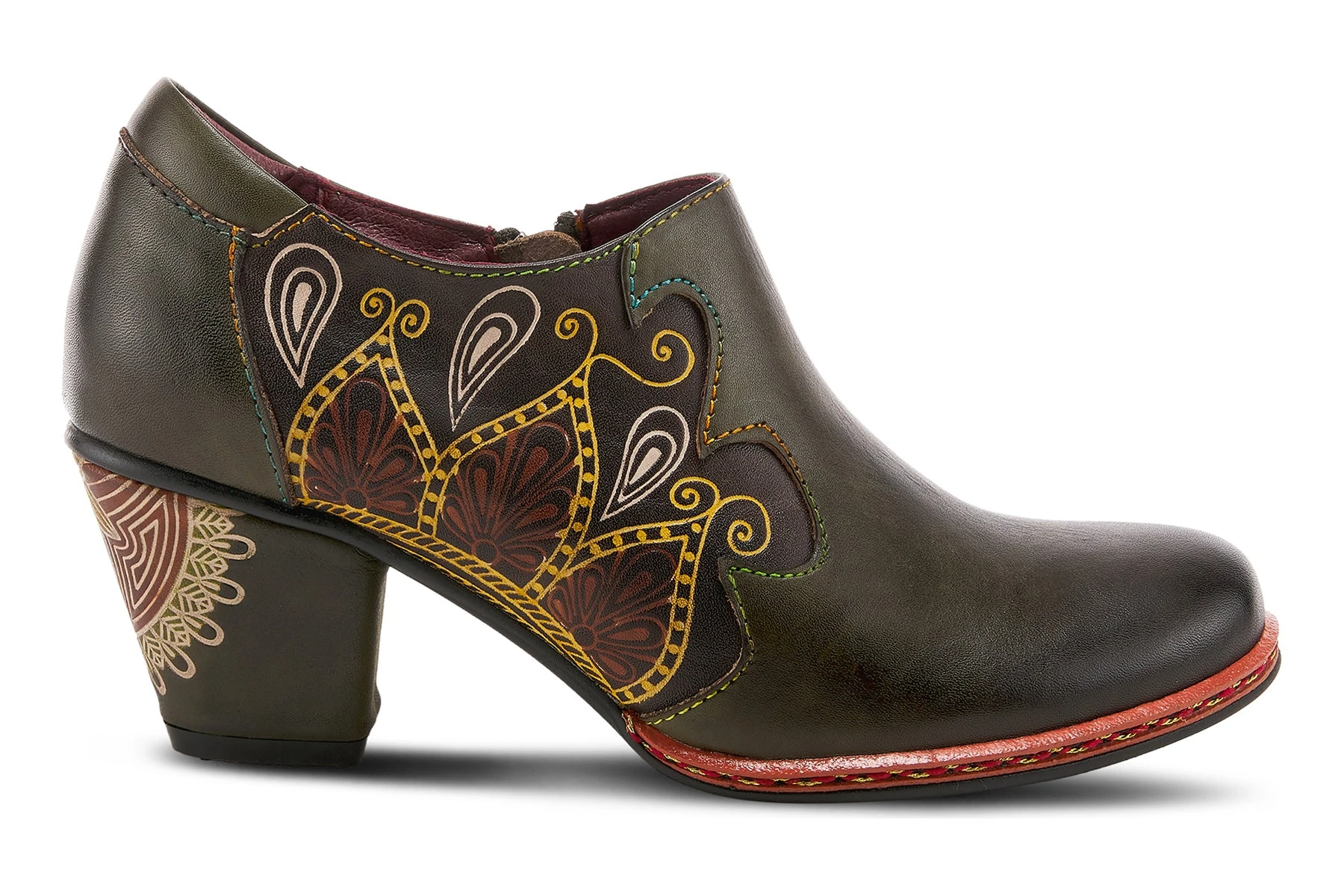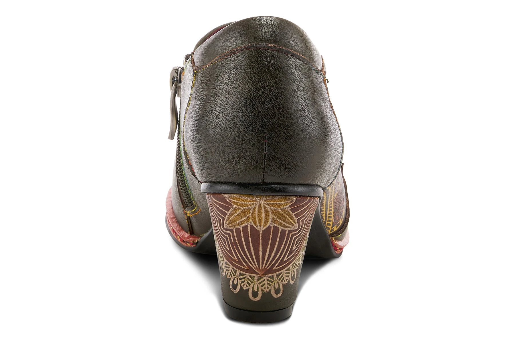 L’Artiste Style: Zami -Beautiful hand painted embossed, burnished and polished leather shootie with inside full length zip and brushed metal pull tab, a padded topline for added comfort all on hand painted leather covered heel.